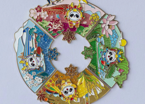 名为“春祺”、“夏安”、“秋绥”、“冬禧”四款徽章,设计灵感来源于传统文化中四时变化中的美好祝愿,以“龙墩墩”的不同状态为主要形象,结合具有奥运特色的建筑,以及四季变化的物候景色,形成四款意义丰富的徽章。四枚徽章单体解构自古代传统玉壁的造型,呈扇形造型。扇柄处的雪花造型是2022年冬奥会火炬装置造型“大雪花”,其分别镶嵌着“春夏秋冬”四字,表达了人们对于四季平安、吉祥的美好祝愿。