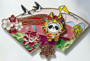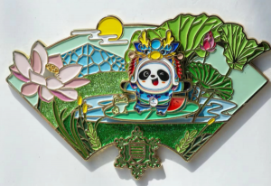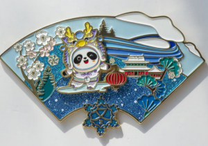 在中国传统文化中,扇为风雅之物,是礼仪之具,常用于君子之间的礼赠。“祥龙纳福”徽章以传统折扇为整体徽章造型,以浅浮雕形式雕刻奥运五环标识作为扇坠。“主角”龙墩墩身着舞龙服,在以海水纹为背景的广阔天地中手持龙头,呈现祥龙戏珠的姿态,祥云和红灯笼在增添民俗喜庆的同时,纪念北京冬奥会二周年。