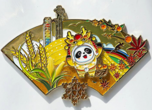 在“秋绥”徽章中,黄金龙墩墩手提果篮,欢呼丰收。主题奥运建筑奥林匹克塔和玲珑塔在秋日麦穗、玉米、枫叶等秋日元素中,显示我国在奥林匹克建设中取得硕果累累的成绩。